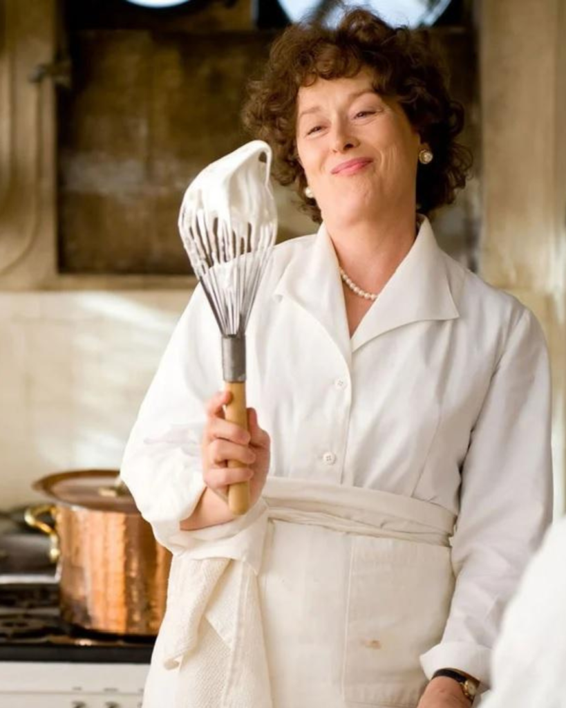 De um lado está Julie, nos anos 2000, em Nova Iorque. Escritora fracassada, lida com a pressão de estar chegando aos 30 sem uma carreira de sucesso. Ela se reinventa ao se desafiar a reproduzir, em 365 dias, as 524 receitas do livro “Dominando a Arte da Cozinha Francesa”, de Julia Child.